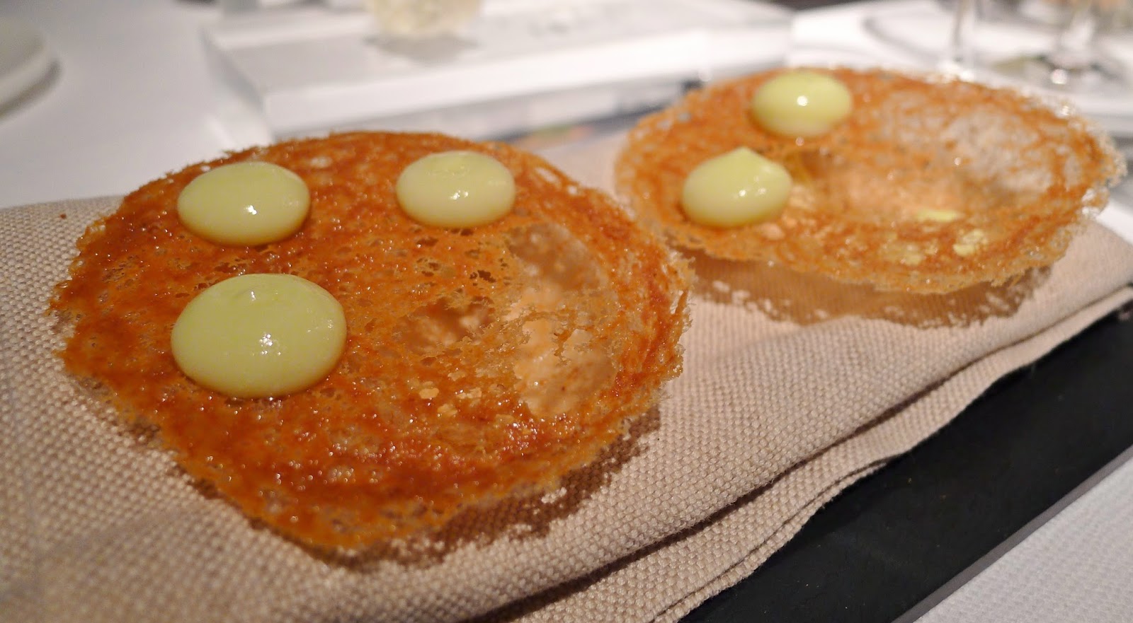 The final appetiser, and certainly the most unique for me, were the crispy pork chips. The circles looked like an emulsion of pork fat, of sorts, made into a crisp; reminding me of pork crackling but an extremely fine and light variation. I wish I could figure out how to make this.